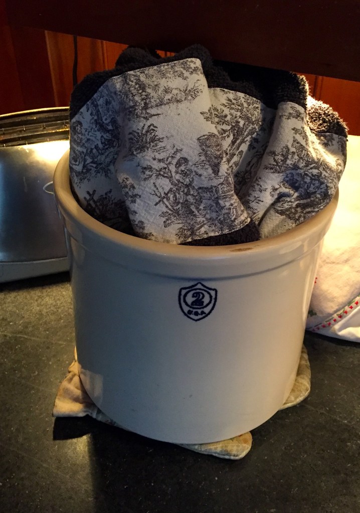 There are many strategies for accomplishing this. There are actual yogurt machines, but I dislike specialty tools since they only do one thing and take up space — usually a lot of space. Anyway, some people put their jars in a crock pot on the lowest setting. I don’t have a jar that fits in my crock pot. You can also wrap your jar in a blanket and put it on a heating vent. I sort of split the difference on these two methods. I wrap the jar in a warm towel and put it into a large, slightly warmed pickling crock.