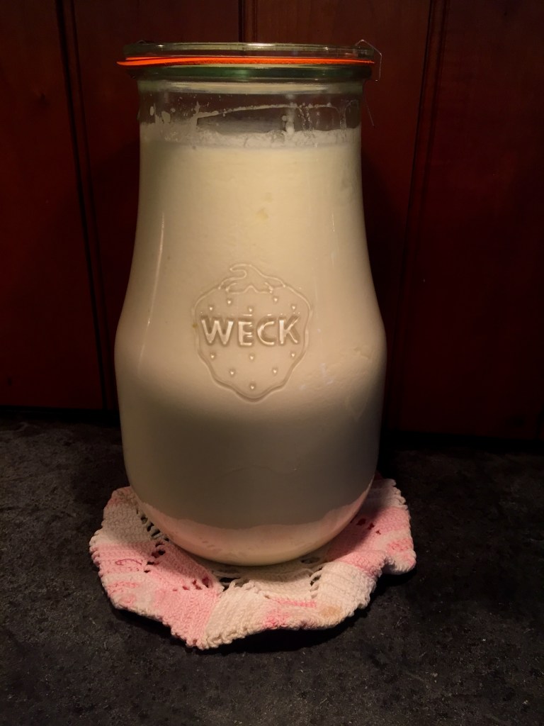 When the twenty minute timer goes off, you need to cool the milk to below 120° (the max temperature tolerance for the microbes) and then keep it above 115° for the bacteria to be active. So you need to act quickly. Get the warm jar out of the oven and put it near the bowl of starter. When the cooked milk is below 120°, gently stir 1 cup of the milk into the yogurt starter culture until the mix resembles thick cream. Then add this mix to the rest of the milk, gently stir it together, and then pour it into the warm jar. (“Gently” because the microbes don’t like to be jostled. This is sort of critical for the next bit.) Wipe the jar’s rim and exterior and close it.