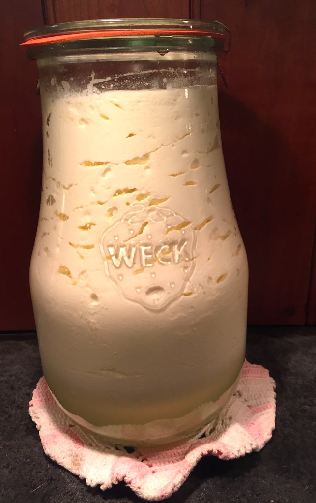 This is where the fermentation begins. For fermentation to work, two things are important: 1) The temperature needs to stay between 115°F and 120°F and 2) the culture needs to remain undisturbed — for at least 6 hours. So you need to find some way to keep it in one place and hold it in this narrow temperature range that unfortunately is below the minimum temperature of most ovens. (Though if you have an oven with a proofer setting, that might work.)