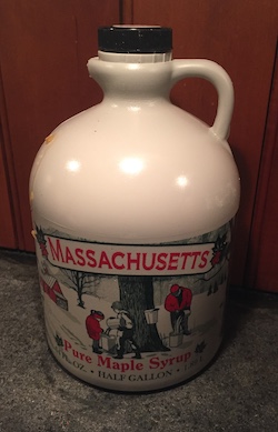 This year, while the tubes and taps and collecting tubs are out and ready, the maple sap isn’t flowing just yet. It’s still too cold. So there won’t be that newly-boiled syrup, but — never fear! — we’ve got a half gallon of last year’s.