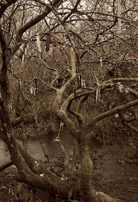 Maeve pulled the pale blue ribbon from her pocket. Even now fear made her body heavy. She moved as though resisted by deep water flowing in fast currents. She treaded the marshy banks carefully, making her way to the Clootie Tree. A silver coin for the pool and a ribbon for the silver branch. She dropped the coin into the waters and watched it sink into the depths. It vanished into the mud with nary a glint remaining. She then reached up with the ribbon and tied it to the hawthorn.