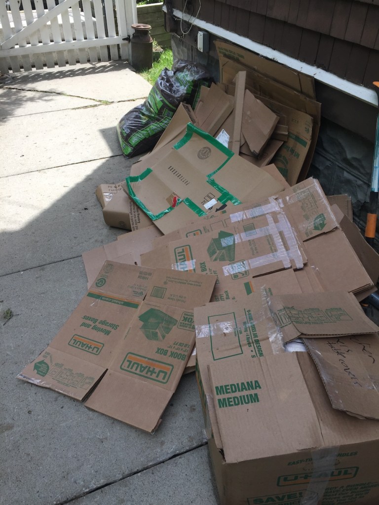 So here’s the mess to be addressed. This is the tail end of the cardboard. Well, no, there are still all the boxes of books to be sorted, but that will take months and may not actually result in too many of them being emptied. Many will merely be shuffled around in the garage. (There is a metric shit-tonne of books out there. Former bookseller, you know…) So this pile is near the end of the waste stream.
