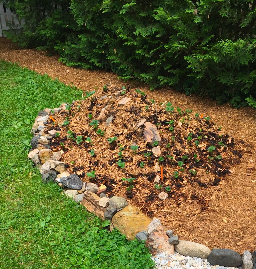 I plant strawberries wherever I go and had already ordered plants from Nourse (the BEST berry supplier in the world, luckily located just a couple hours south of here). So I decided to plant the strawberries in the mound. I built the mound in the somewhat shaded back yard, close to the spigot (and also the kitchen door) so I could keep the plant roots moist and cool while the mound begins to break down. I planted the strawberries — six varieties of twenty-five plants each — on close centers, like the spacing one uses to fill an ornamental planter with annuals. Strawberries are short-lived perennials that spread like mad. Not all these initial plants will be productive, but the mound will be covered quickly.