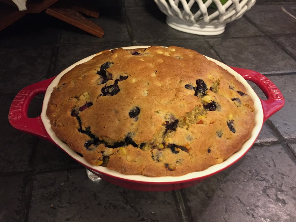 3 eggs, beaten frothy 1 cup dry hard cider (I used Safety Meeting from Stowe Cider for the hops in it.) 1/4 cup corn oil or melted butter 1 cup all-purpose flour 3/4 cup cornmeal 3 TBS maple sugar (or some sweetener of your choice) 2 1/2 tsp baking powder 3/4 tsp salt 1 tsp ground allspice 3/4 cup whole corn kernels 1 cup green chile, peeled, roasted & chopped 1 cup fresh blueberries