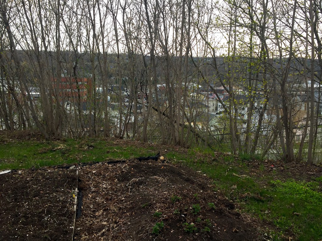 We cut down all the sumac, vines and brush on the ledge, leaving the roots intact to hold the bank. Small brush was piled up against the stumps as a further protection against erosion. I thought about covering this with biodegradable landscape fabric and mulch. However, I haven’t quite decided if that will be easier to maintain, or if it would be just as easy to lop off whatever tries to grow from the roots. I have these fabulous loppers that can reach about 5’ and can cut through even dead wood like a hot knife in butter. So it may be easier to forego the fabric and just spend an hour or two a season cutting down the sprouts. Because sumac will grow through the fabric anyway, I’m thinking…