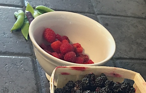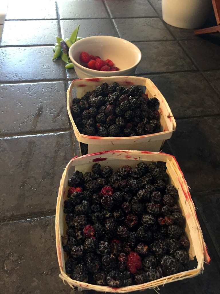 But strawberry season is running down. (It’s July! How did that happen!) So it’s time to transition to raspberries. I have canes from the former folks that produce a heavy crop of black raspberries. These aren’t as flavorful as I’d like, neither as sweet as red raspberries, nor as tart as blackberries. But the birds and rodents mostly leave them alone because these canes have vicious thorns. So, given a certain tolerance of abrasion, I get to eat the majority of the berries. (Though there was a debate with a robin who was clearly put out by me picking the berries he hadn’t already eaten…) They make good jam and are pretty good in scones and I can freeze these as well. They’re small enough that a pint freezer-bag can hold more than a week’s worth of breakfast berries. I should get 6-8 pints out of these bushes. Should keep me in raspberries for the winter.