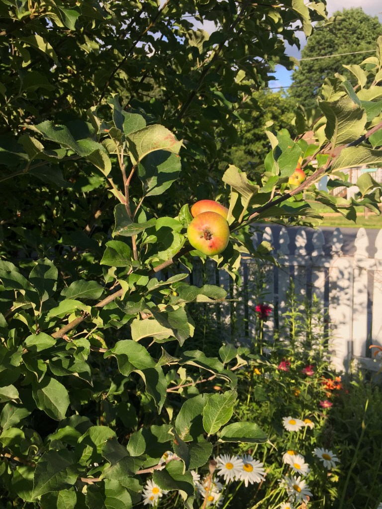 True, there are apples on the young trees, but I think these poor things have not yet learned the year’s schedule. They bloomed so briefly and so fast on the heels of our very protracted winter, I didn’t think it possible that insects were awake yet to pollinate the blossoms. Clearly some were, but all the fruit is low on the tree, as though whoever was active in that May warm spell — the same one that sent all my arugula to seed — was seeking cover or just not sufficiently enlivened to make it all the way to the upper branches. So I don’t think apples signify in this case. They are confused just like I am.