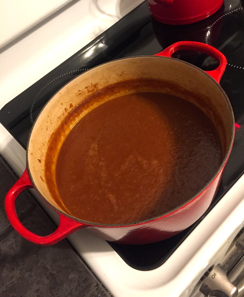 Put all the ingredients in a heavy-bottomed pot. I used my Dutch oven, but you could use a slow cooker and more time for the same results.