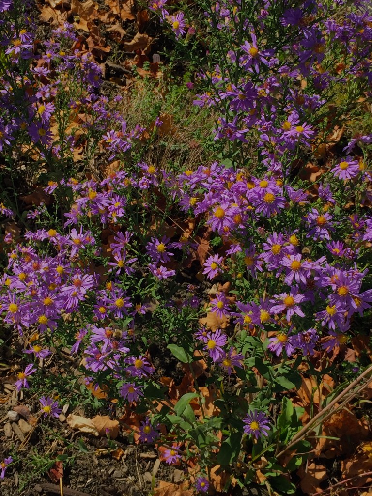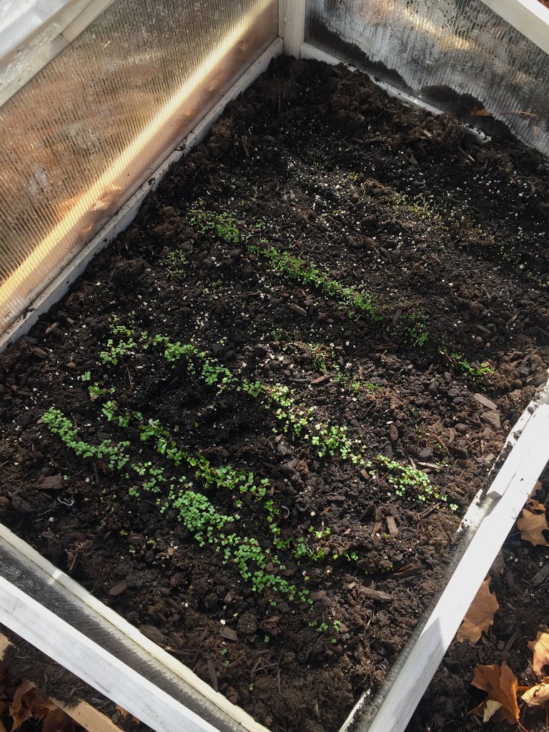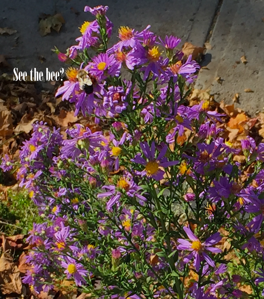 The escarpment in front of my house is also out-performing all expectations. I anticipated several growing seasons before the perennials I planted began to out-compete the bullying quack grass and other aggressive weeds. But here we are just over a year into the project, and there are asters tumbling their purple exuberance down the slope and fairly vibrating with buzzing insects of all kinds. (Except butterflies… sadly, those have not appeared yet… ) Again, this is very late in the year to have so much activity in the garden. But this morning I took my camera out to capture the new sprouts in the cold frame bed and could hear the bees from yards away. I had to stand there for many minutes just watching them dancing about in the autumnal morning sunlight, doing their bee things.