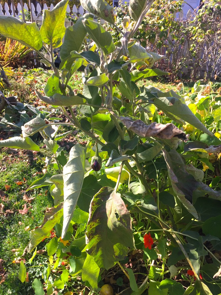Similarly, I have undead eggplant and chiles in the same de-beaned bed. This is the end of October, folks. We’ve had weeks of frost, enough to kill the nightshades and nearly everything else in other beds. But the tender plants in this mound are seemingly impervious to cold. They’re still putting out new flowers, new leaves and new luscious fruit. I have eggplants that will be baba ganoush for Halloween. Isn’t that too nutty!