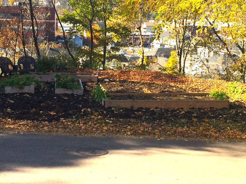 The main beds of my veg garden are put to sleep for the winter, but it still looks compelling over there. The leaves from my neighbor’s maple create a lovely contrast with the cosmos, zinnias, nasturtiums, marigolds and calendulas — all of which are still in flower. I still have bouquets if I want them… and being fluffy, I do. (I like to hollow out small pumpkins and use them as vases… ) The mulch that I put down as weed suppressant and insulation is also rather lovely with the white lace of morning frost on its dark and irregular surfaces. The garlic has not made an appearance yet, so I’ve got the row covers off for now. But there is something about a bed of clean soil that draws my eye — and my hopes. Maybe it’s the promise of food and flowers. Maybe it’s just the rich dark mystery of it all. But I like the beds in these weeks when the weeds aren’t rushing to take over every exposed bit of dirt and the rotting squash vines have been tidied away. I like the hopeful canvas a clean garden bed presents, I suppose.