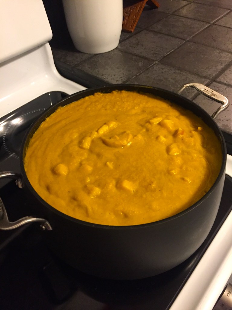 It being cold and damp, this week’s Pot of Something is a green chile and roasted winter squash curry (ish) with roasted potatoes. This seems like a good recipe to share since it’s highly versatile and is filling and warming for these cold winter nights. Also, with everything from winter squash to turmeric in there, it’s about as packed with nutrition and various beneficial phytochemicals as it gets. A real tonic for the whole body!