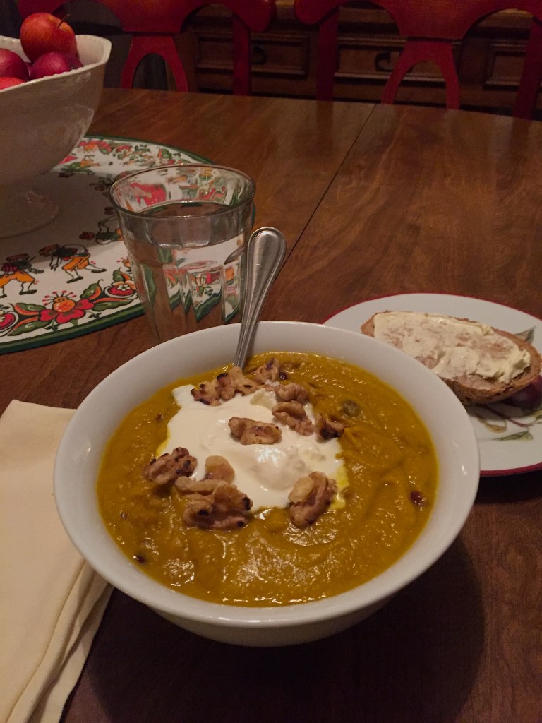 Today I used a quart of veg stock, two cups of yogurt and one cup of my farmer cheese (sort of cottage, sort of ricotta, not a lot of strong flavor). I sometimes use cream or half-&-half, sometimes leftover creamy tomato soup, and for special weeks I use goat cheese and the turkey stock I make and freeze after roasting birds for the family holiday meals. (Stock is about the only carcass-derived thing I can reliably digest these days…) I put the immersion blender in the pot and puréed the whole thing into a thick soup. You may need to add water to thin it out, depending on the variety of winter squash you use. I used Hubbard which is watery. Things like kabocha and kuri are more starchy and need the added liquid so as to not scorch, particularly if you are going to eat out of the pot all week and therefore will be heating it up repeatedly.