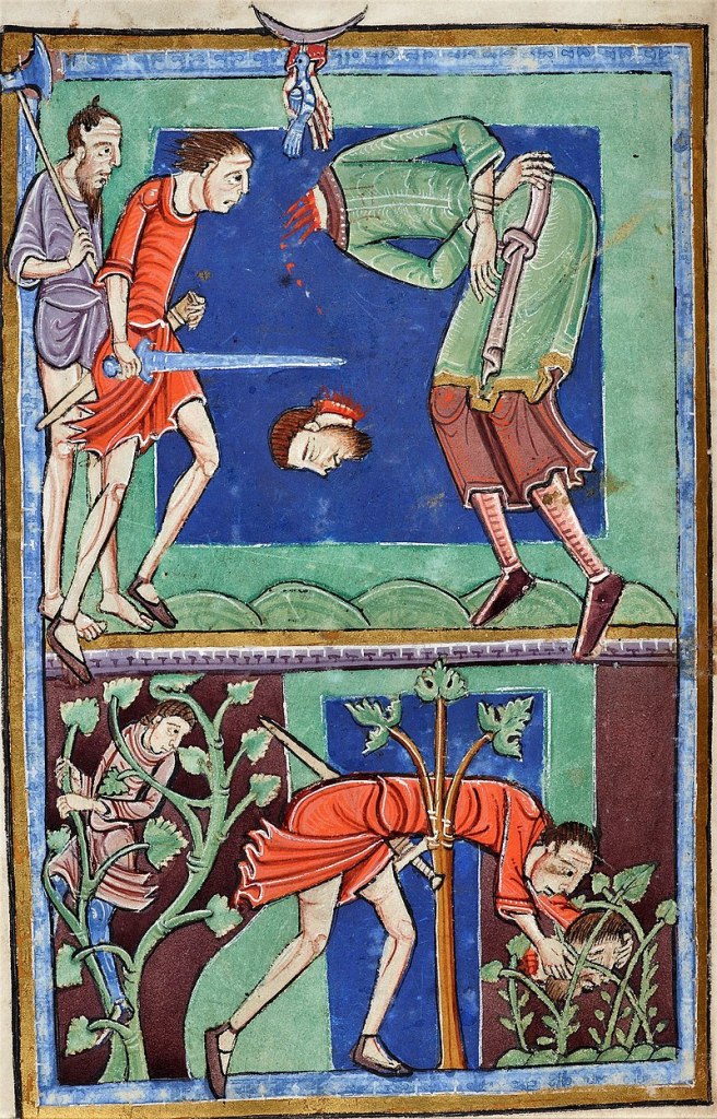 But even in this folio image from the time of Chaucer, one can see that this version of Edmund’s story is not the whole picture. Why is it that the Danish soldier who beheaded Edmund looks rather sad? Well, apart from the fact that he’s cutting off a human head… but he’s a Viking soldier… presumably he has experience with this sort of thing…