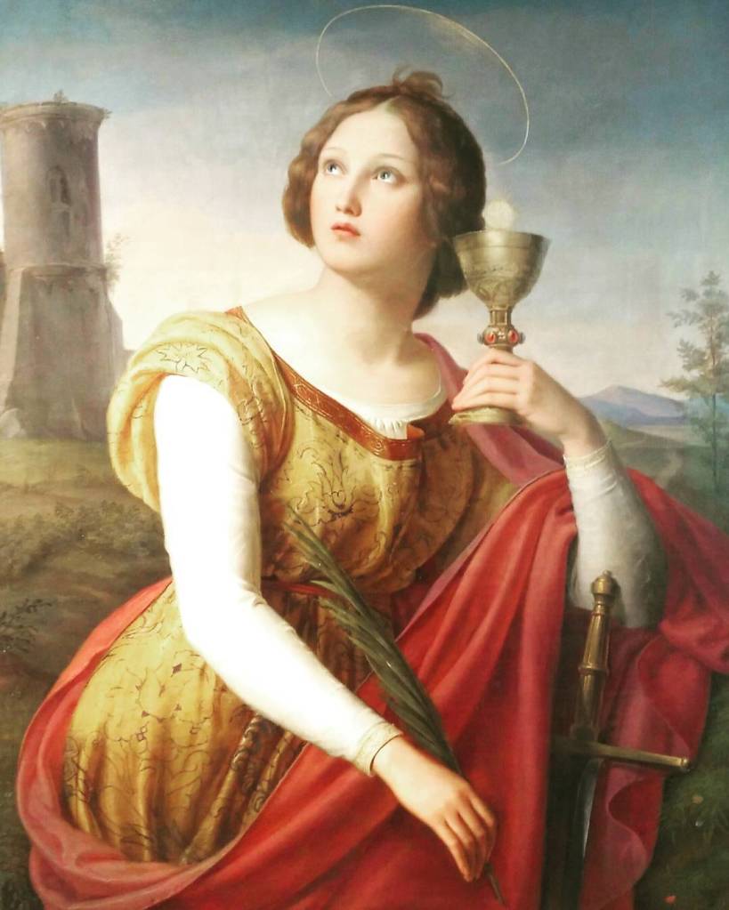 St Barbara is the patron of Santa Barbara, California, among other places. She protects the faithful from fire and lightning. She gives special aid to miners and stoneworkers, presumably because she found refuge in her stone tower which is also her emblem. She is usually depicted holding the sword that took her life and the palm branch of her martyrhood, though the branch often looks more like a quill. She holds it like a writing tool. In Greece, the faithful believe that she guards against smallpox and other plagues. As protector against sudden death, she holds a chalice of communion wine in one hand, so that those who die unexpectedly will be able to take communion on their way to the afterlife.