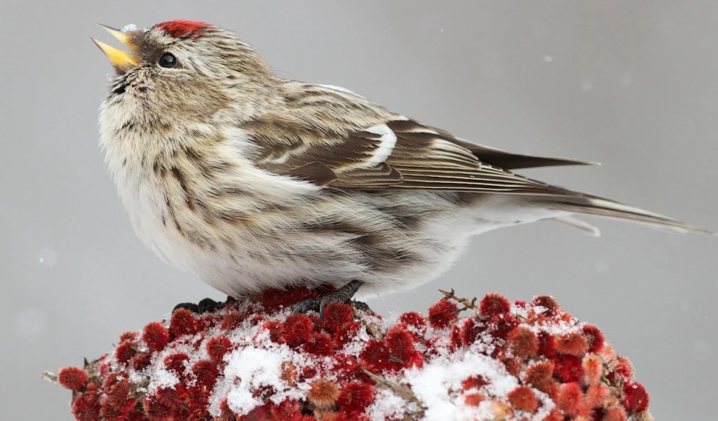 In direct defiance of the weather… This morning, I saw a flock of redpolls munching on maple buds in my neighbor’s tree. This tells me that there are buds full of sugar, for one thing. But also the redpolls are heading north again. I don’t know what they smell in the wind. Maybe it’s the very fact of that air from their Arctic summer home telling them that it is less cold up north. But there they were, flitting among the thinnest branches, snapping up red candy bites, quietly chattering about redpoll things. They were not particularly interested in my seed and suet feeders…
