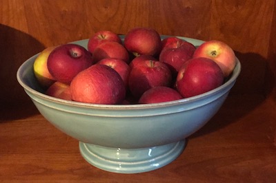 A note: the apples don’t have to be too fresh. In fact, it is better to use slightly drier fruit both to absorb more alcohol and to keep the batter from turning runny. You can use the wrinkled things from the cold cellar. Or you can use dried apples or fruit leather. Chop these somewhat finer than fresh apples to increase surface area absorption.
