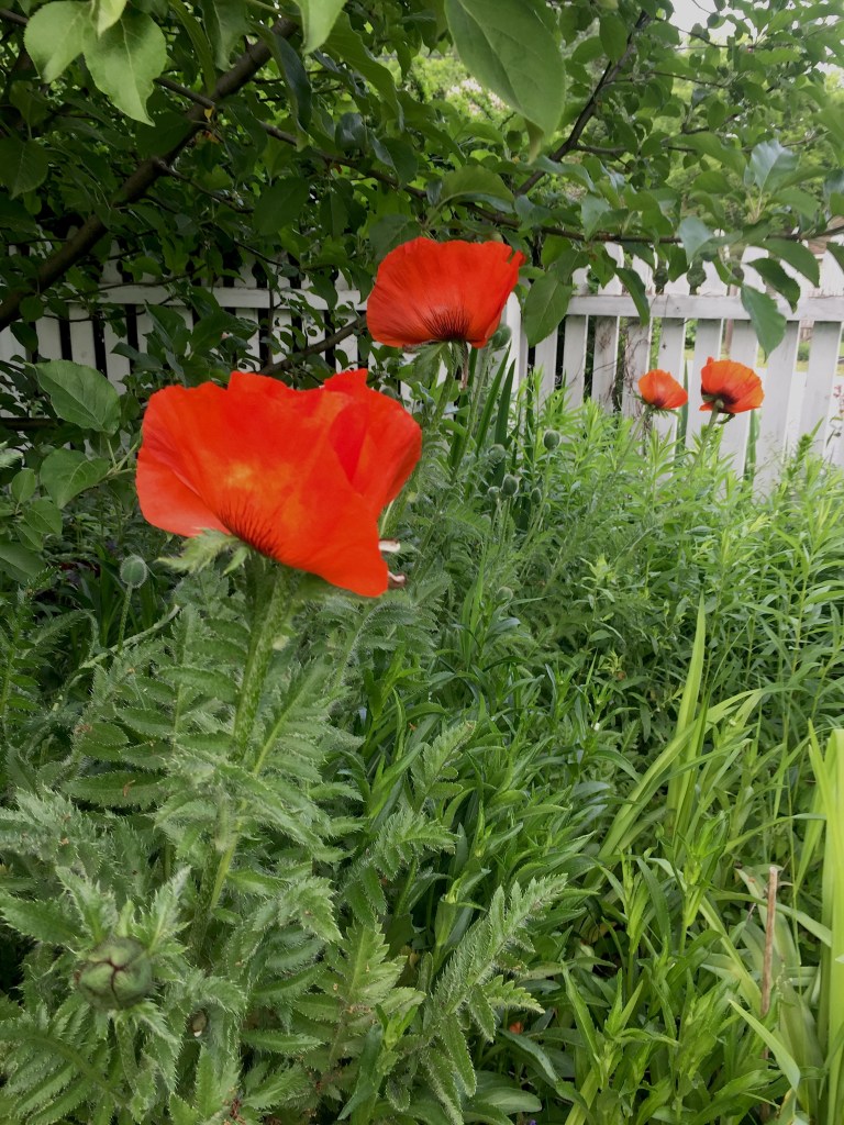 In my garden, orange columbine, vermillion poppies and the aptly named, rainbow-hued iris are opening. There are fringed pale dianthus and sulfur buckwheat and hot pink bleeding heart. The herb bed is starting to turn cool blue and meditative purple with chive flowers, sage, and speedwell. In the grass, dandelions and violets and ground mint are running riot. I have strawberries in bloom everywhere now, and many plants have set fruit. It may be a late fruit season, but it will be plentiful. (I had my doubts with those late May freezes.)