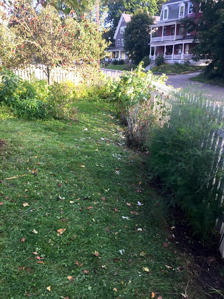 Returning the garden to spareness in preparation for the snows that may fall as early as Halloween here in New England always brings me peace. I do love the growing garden. I love watching plants do what they will. But at this point in the growing season I am tired of rampant growth. I want cleaner lines and less chaotic mess everywhere. The last few weeks of every growing season are a time of plant desperation. Every vine will send out meters of trailing plant to smother every surface. Every stoloniferous plant will wind its way out of beds, sending up suckers wherever there is sunshine. Every tree and shrub is a rain of seeds and leaves, small dead creatures and large limbs. It’s exhausting. I often feel like the plants are taking over, smothering the house and choking each other in their late season Dionysian frenzy. This year, with all the rain and the late sunshine forcing plants to do most of their photosynthesis in September, it felt oppressive, like I was living under siege. So cutting it all down is one of this gardener’s greatest joys, especially this year.
