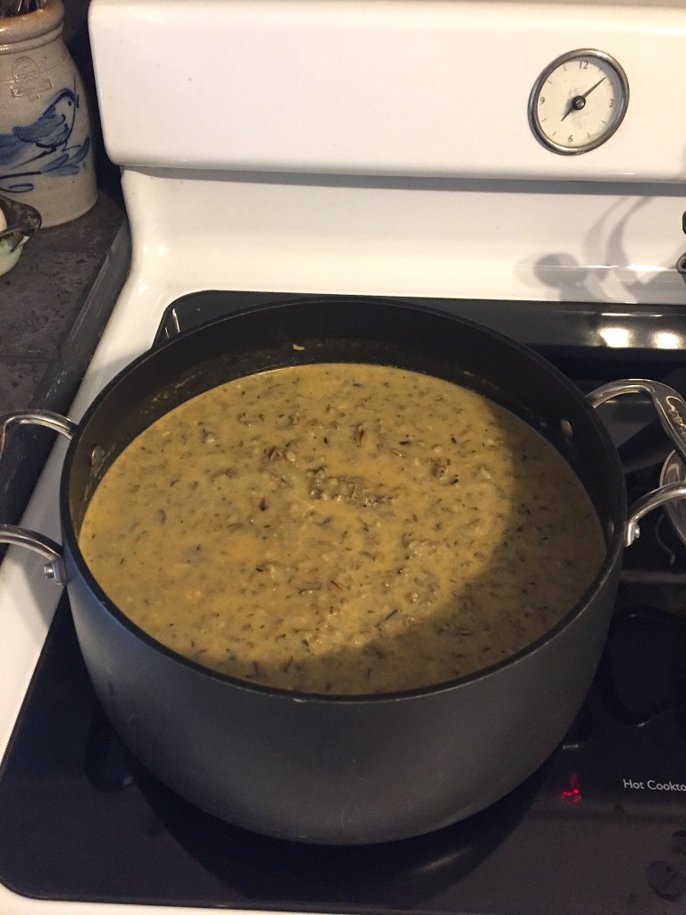 It’s not much to look at, but it smells divine — rich and nutty and sweet. It tastes even better. Though, I think I may add sautéed mushrooms next time I make it — or even later on this week. That’s the great thing about a pot of something; you can add things both for flavor and to stretch the pot.