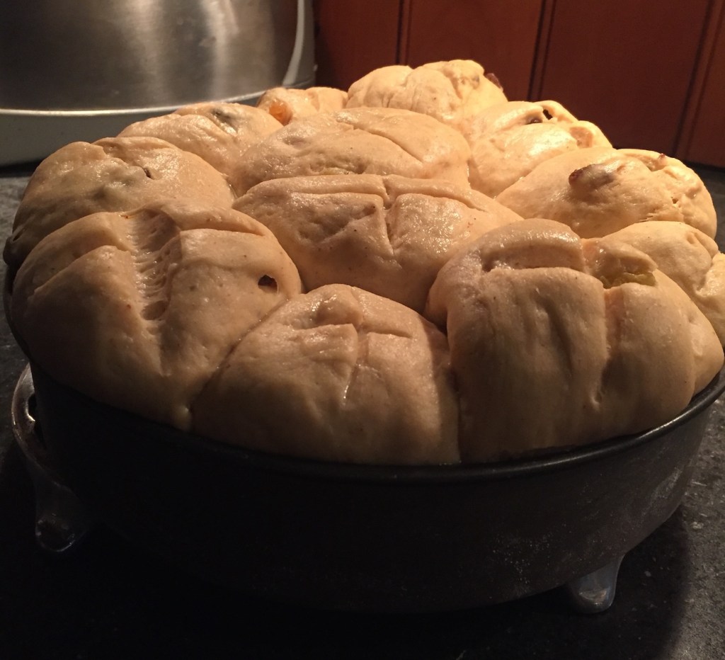 I am not making buns today. There’s this stupid job thing that gets in the way of living these days. So here is the recipe I made a few years ago. It is how I normally make them — when freed from stupid job things, that is… For those who want to do vegan buns, I think you could easily skip the eggs, or do whatever you normally do for egg-breads. The dairy is more difficult, but almond milk is probably good. If you like such things, coconut milk would probably be very good. Veg shortening would probably suffice as a butter substitute, but I’m sure you have your own favorite butter work-arounds in baking.