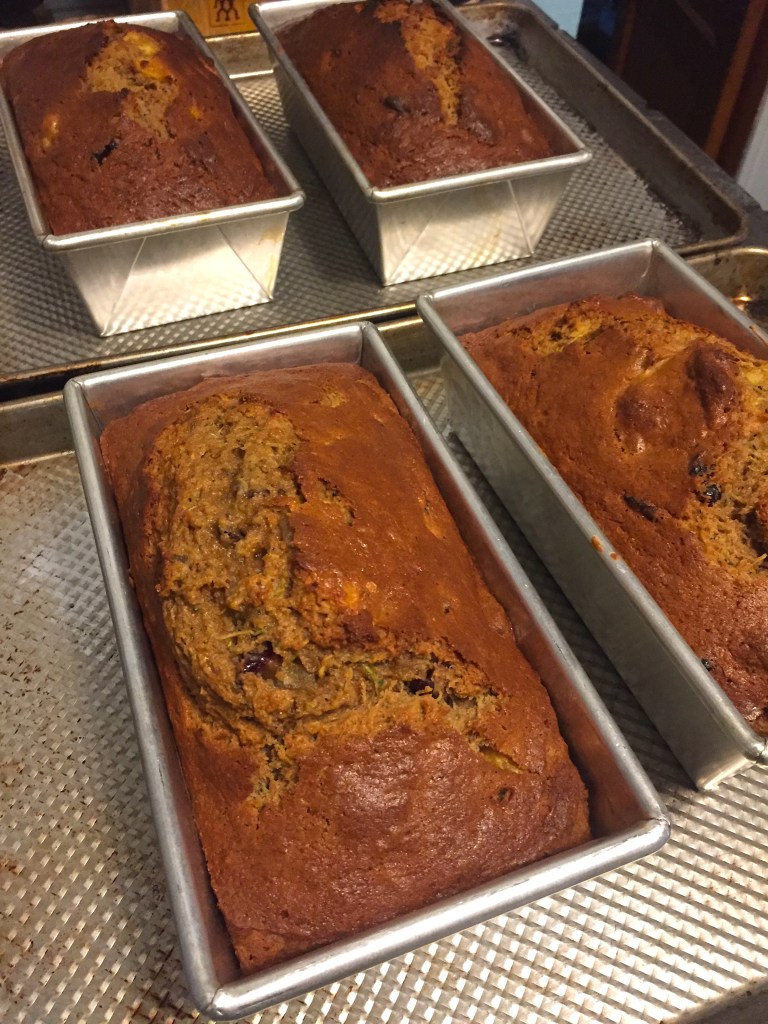 Again, because this is done to use up produce, most of these loaves go into the freezer. Just to make it easy to defrost in my microwave-less home (in the oven, set on “warm”), I wrap the loaves in heavy foil and then put this into a gallon freezer bag, removing as much air from the bag as I can. (I’ve even gone to the length of sucking air out… because I’m weird…) Make sure you label the bag. Even if you don’t use the foil, you’re not going to remember what recipe is inside. Place the loaves in a single layer in the freezer until they are frozen solid. Later, you can stack them up like bricks. Use them within a year. I’m pretty sure they keep longer than that, but you’ll want to have your freezer empty before the next squash deluge.