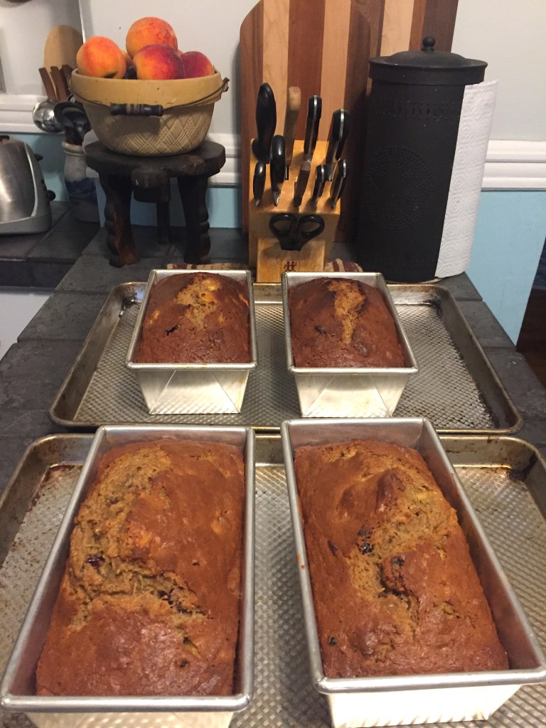 Today, I have a recipe for zucchini bread that includes the summer’s peaches as well as the abundant cucurbits. You can use any summer squash for the “zucchini”, but the longer varieties make for easier shredding. You can shred patty pan squash; but it’s seriously annoying, a little too much actual skin in the game, so to speak. I do not follow the instructions to leave the peel on the fruit, so it doesn’t matter if I use over-ripe yellow crookneck (which makes an almost gourd-solid rind) or tender young zucchini. I also tend to remove any well-developed seeds, but I’m not too strict on that, preferring to see that as extra protein crunch in the bread.