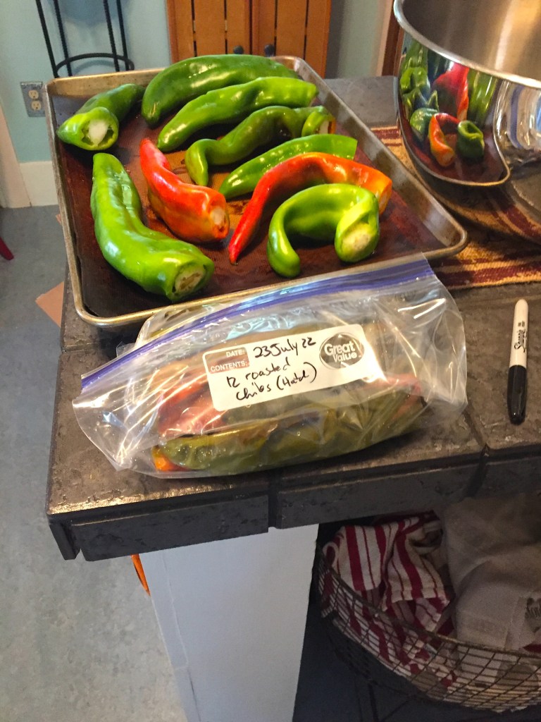 At this point, you can peel them and chop them and then pack the chopped chile into freezer containers. But last year I discovered by accident — another round of chiles that showed up at an inopportune time — that dropping them whole and unpeeled into freezer bags works just as well. Better for me actually because I can thaw the pods and then stuff them with my home-made ricotta to make rellenos — which you can’t do if the chiles are, you know, pulverized.