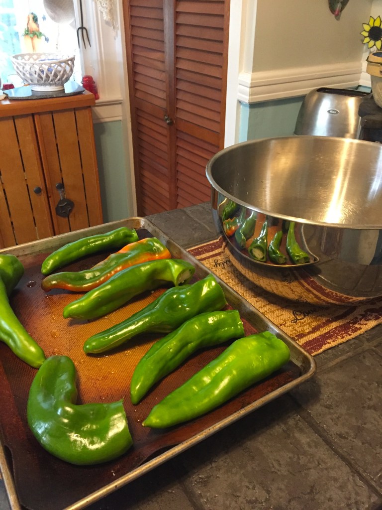 I had to do the usual bread and yogurt before the chile roasting. I had forgotten how pleasant it is to have heating elements that hold temperature. I hardly had to pay attention to the warming milk. Then I baked a couple loaves of ciabatta. This oven uses convection heating. The difference in bread quality is astonishing even inside the ciabatta pan. But the wonderful thing was the chiles. This range has two broiler settings, low and high. Setting it on low allowed me to use the broiler and shave off about 10 minutes for each batch of chiles. Which doesn’t sound like much, but with a dozen batches, that’s two hours. It also isn’t as hot as cranking up the oven temperature and roasting them from the bottom. So this round used less energy and put less waste heat into the kitchen. It wasn’t no heat, but it was tolerable.
