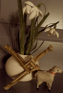 First, let’s look at the more common name for this festival — St Brigid’s Day. I’ve already gone over this ground. To not repeat too much, it is enough to say that Brigid is a symbol of transformation, a provider of well-being, a deity of water and fire. All those things scream “cleaning” to me. If the name Imbolg is tied to Brigid, it is more probable that it relates to ritualized cleansing in preparation for the renewal of spring than relating to sheep. Brigid is not memorably associated with sheep, even though she seems to have adventures paired up with all sorts of other animals — from cows to snakes to hedgehogs.