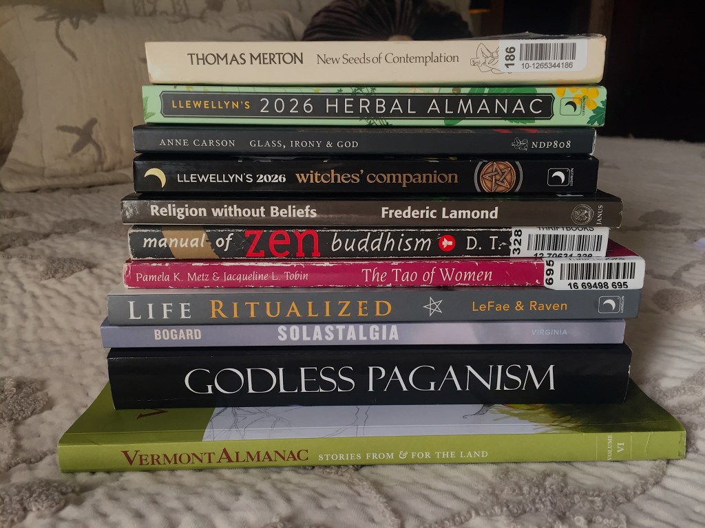 I’ve always had the habit of reading from a pile of what some people call “spirituality” books, though it’s a rather eclectic sample, some only tangentially spiritual. Most are collections of essays, since that is the form that pulls me. When the mood strikes, I gather up the pile and read a little from each for an hour or so.